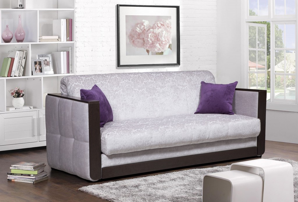 Оснащен ящиком для хранения белья. Узкие подлокотники и различные варианты исполнения размера спального места позволяют вместить данную модель в любое пространство.