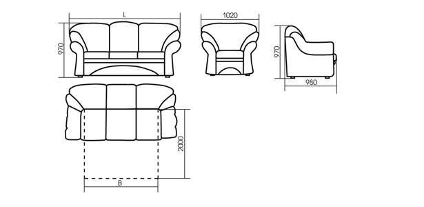 Диван 3-х местный: Длина 2000 мм, Ширина 1400 мм, Высота 970 мм. Диван 2-х местный: Длина 1500 мм, Ширина 960 мм, Высота 970 мм. Кресло: Длина 1140 мм, Ширина 600 мм, Высота 970 мм. Спальное место: 2000 х 1400 мм. |