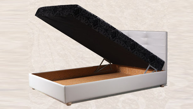 Эта модель является одной из самых популярных. В основании расположены вместительные отделения, доступ к которым обеспечен за счёт прочного и простого в использовании подъёмного механизма. Конструкция кровати с подъемным механизмом зарекомендовала себя лучше, чем простые тумбы или комоды для белья, которыми не всегда удобно пользоваться в спальне с маленькой площадью.